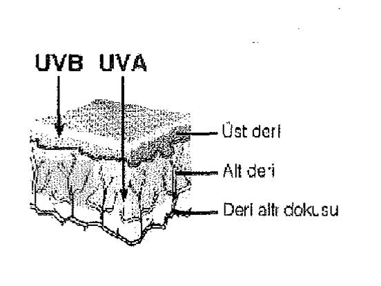 UVB UVA Üst deri Alt deri Deri alt dokusu Deri UV ışınlara maruz kaldığında korunma mekanizması olarak Stratum corneum kalınlaşır ve melanositlerde melanin pigmenti sentezlenir. Melanin UV radyasyona karşı cildi koruyan en önemli faktördür. Ciltte renk oluşumu ve Stratum corneum'un kalınlaşması neticesinde bir hafta süresince güneş ışınlarına maruz kalmakla güneş yanığına karşı hassasiyet azalır. UV-A ve -B'ye etkili olan preparatlann yanı sıra uygun antioksidan (antiserbest radikal) ve karışımları (a-tokoferol v.b.) kullanılmalıdır.